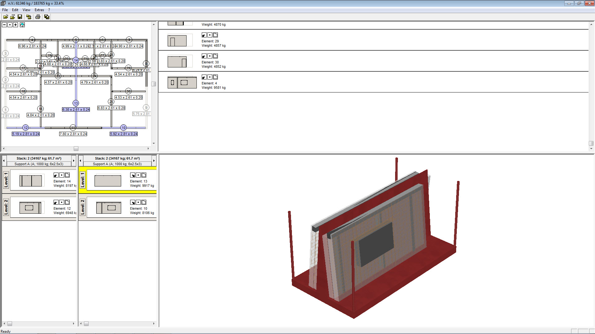 Im Stacker werden die aus dem CAD importierten Fertigteile lagerichtig im Grundriss dargestellt. Durch einfaches Anklicken der Elemente werden diese im aktuellen Transportgestell platziert. Das Programm überwacht aktiv das Gewicht und wählt automatisch einen neuen Stapel, wenn das voreingestellte Maximalgewicht erreicht ist. Ebenso wird bei der vertikalen Stapelung der Schwerpunkt des Stapels ermittelt und dem Anwender angezeigt, so dass dieser evtl. korrigierend eingreifen kann. Der Stapel wird 3-dimensional dargestellt und kann von allen Seiten betrachtet werden.